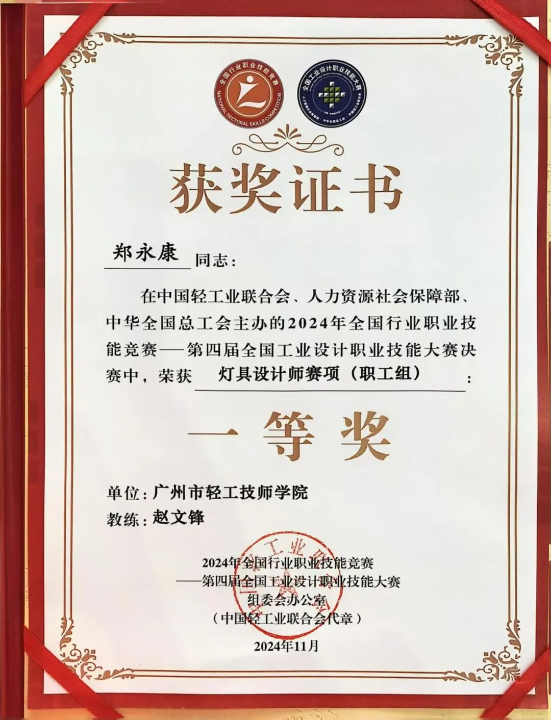 ▲郑永康老师荣获2024年灯具设计师赛项(职工组)第一名