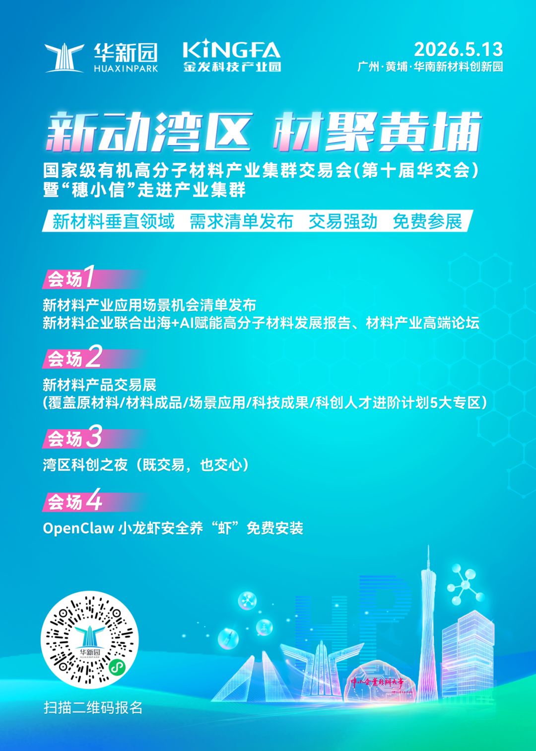 5月13日(星期三),一场属于科创人的温暖聚会——国家级有机高分子材料产业集群交易会(第十届华交会)暨湾区科创之夜,将在广州黄埔华南新材料创新园盛大开启!