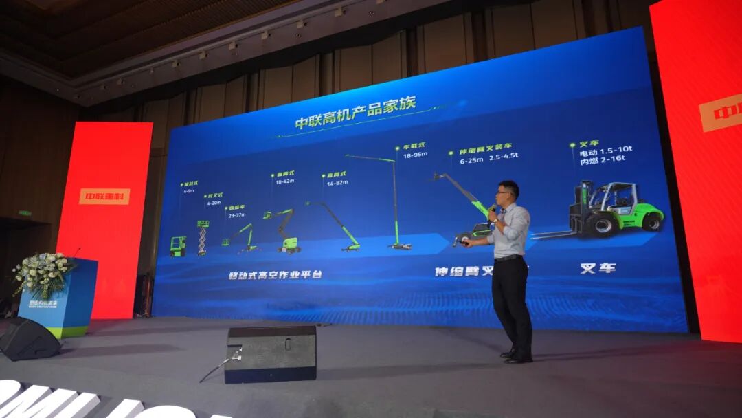 中联重科智能高机在晚宴现场发布包含自行走式高空作业平台、伸缩臂叉装车、叉车在内共8个系列82款产品。高空作业机械系列产品作业高度覆盖6~95米;伸缩臂叉装车系列产品举升高度覆盖6~25米,最大载荷4.5吨。