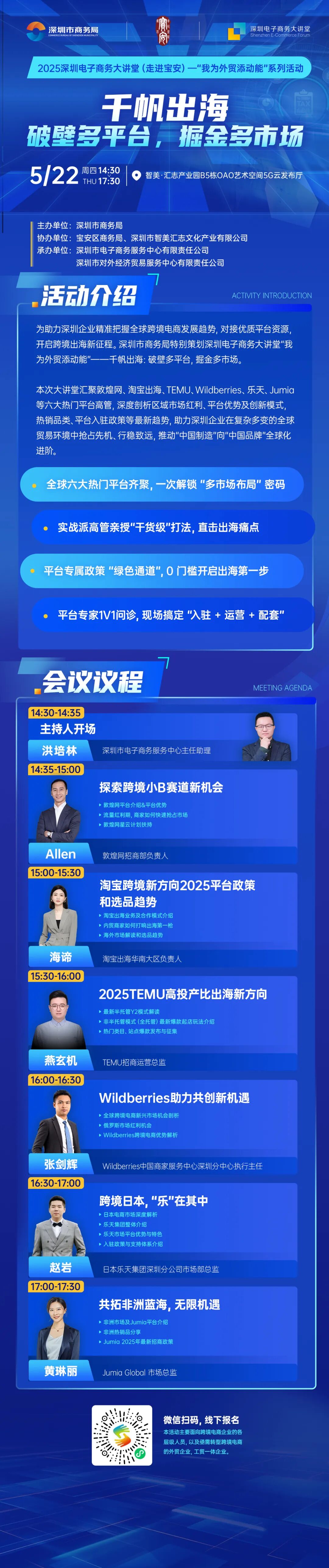 本次大讲堂汇聚敦煌网、淘宝出海、TEMU、Wildberries、乐天、Jumia 等六大热门平台高管,深度剖析区域市场红利、平台优势及创新模式,热销品类、平台入驻政策等最新趋势,助力深圳企业在复杂多变的全球贸易环境中抢占先机、行稳致远,推动“中国制造”向“中国品牌”全球化进阶。