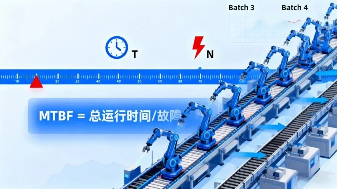 机器人可靠性是指机器人在规定的条件下和规定的时间内完成规定功能的能力。从机器人的角度考虑,涉及到的可靠性指标有失效率、平均无故障间隔时间、使用寿命等。其中平均故障间隔时间(MTBF)和使用寿命分别从产品的运行稳定性和耐久性进行考核,是表征机器人稳定、可靠、耐用的重要指标。
