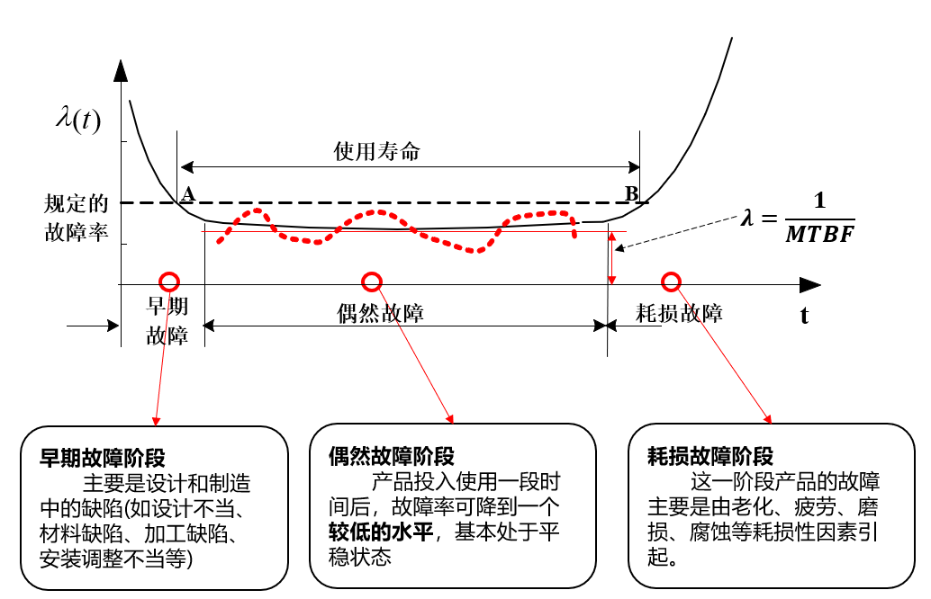 平均无故障运行时间(Mean Time Between Failure,简称MTBF),是衡量产品可靠性的重要指标。平均故障间隔时间是产品在相邻两次故障之间的平均工作时间,它是可修复产品的一种基本可靠性参数。MTBF主要考核偶发形故障,是失效率的倒数,通过MTBF测评可以得到产品的失效率,浴盆曲线的盆底高度即为失效率。MTBF值越高,说明产品的可靠性越强,故障率越低。