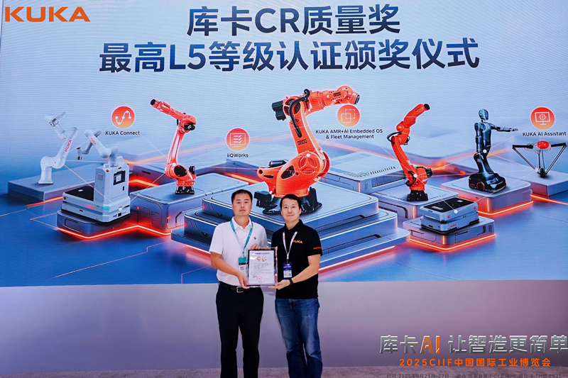 2025年9月24日,在2025中国国际工业博览会(工博会)现场,国家机器人检测与评定中心(总部)为库卡(KUKA)机器人颁发最高可靠性等级(L5)证书。
