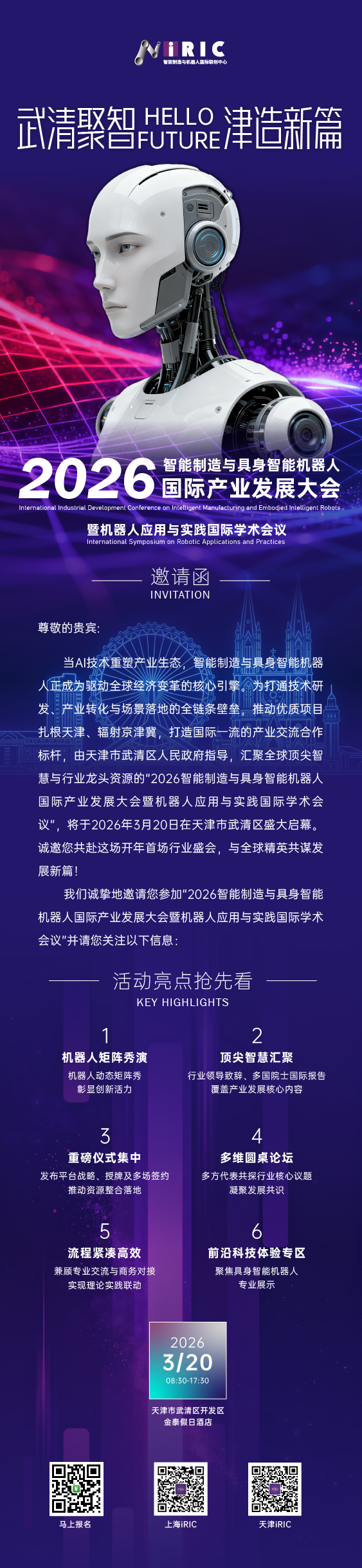 当前,智能制造与具身智能机器人技术虽备受瞩目,但研发、产业化与应用落地之间仍存在壁垒,亟需建立高效协同的交流机制。本次大会紧扣行业痛点,以 “具身智能技术前沿探讨、2026年发展趋势、落地场景” 为核心,诚邀海内外顶尖院士专家、政企代表、学界精英共赴盛会。来自埃及、新加坡、德国、日本等多国的院士,以及清华大学、上海交通大学、日本大阪大学、浙江大学、天津大学等国内外顶尖高校的行业权威,将带来前沿主题报告。知名企业齐聚一堂,覆盖智能装备、工业机器人、AI 应用等全产业链。通过 “展览展示 + 行业峰会” 的创新形式,大会将搭建起信息共享、资源对接、项目合作的核心平台,推动理论与实践全链路对齐,助力天津智能制造与机器人产业集群化升级,为区域经济注入强劲活力,在京津冀产业协同发展的蓝图上写下浓墨重彩的一笔。