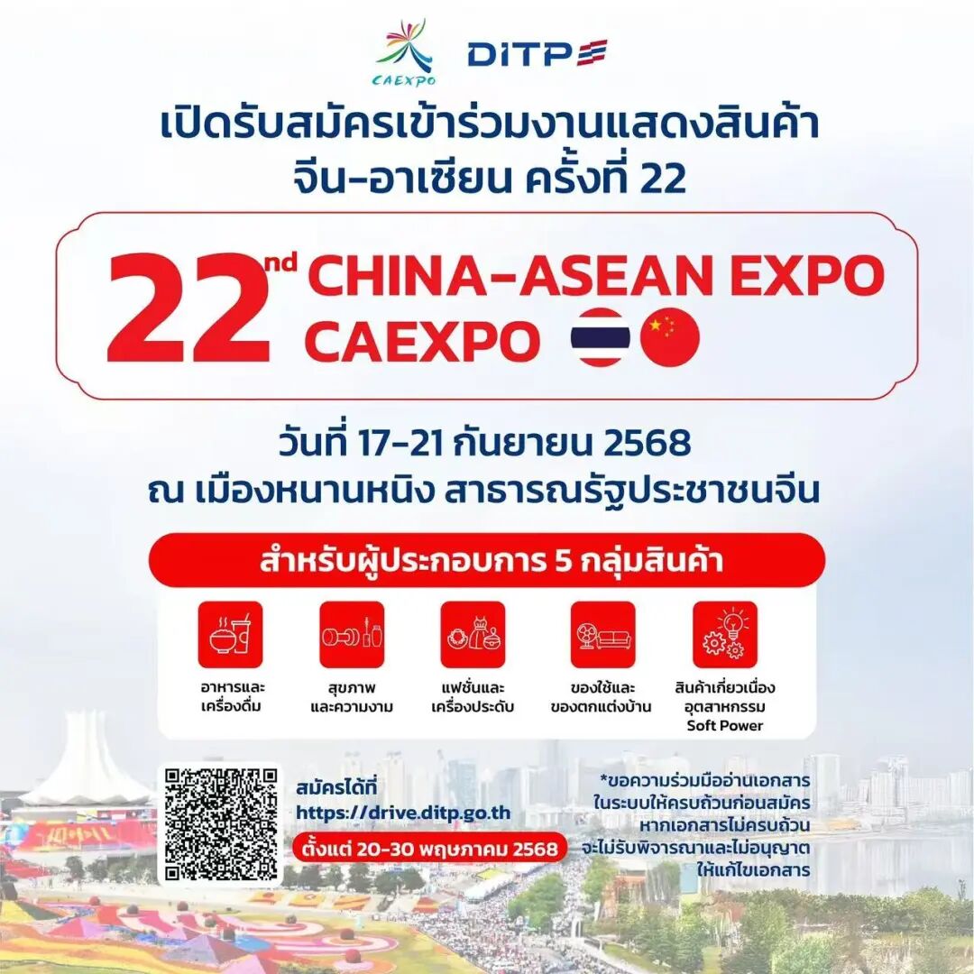 📢 第22届东博会初步定于2025年9月17-21日在中国南宁举办,目前泰国馆的招展工作已经开始了,诚邀感兴趣的企业欢迎报名参展。