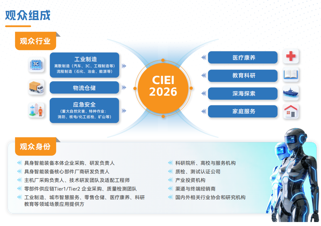 上海国际具身智能产业博览会(简称CIEI2026)——聚焦“具身智能”全产业链的前沿融合型国际展会平台,CIEI2026旨在构建一 个超越传统展览的价值新枢纽。将以“技术革新”为支点,“生态融合”为脉络,不仅汇聚全球前沿科技与顶尖企业,更深耕于商务合作、理 念共创与未来洞察的核心场景。 在CIE12026,全球产业链资源将被高效链接,从关键技术、核心部件、系统集成到多元场景应用,形成闭环。我们全力推动人机协同从概念走向广泛落地,加速产业生态的系统性升级,共同缔造一场定义智能装备未来图景的世界级思想与产业盛宴。 CIEI2026——以具身之名,赋能当下,智见未来,共创下一轮增长纪元。 |