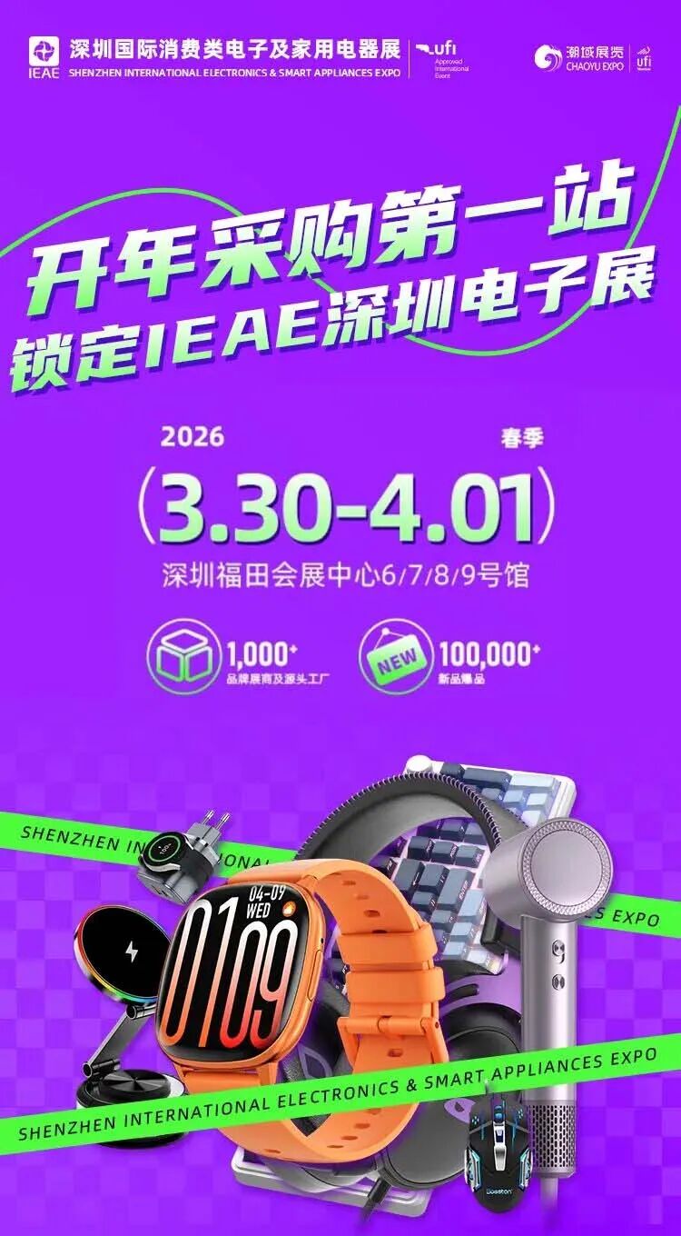 由广东电子商会支持、广东潮域展览有限公司、广东潮域科技有限公司主办、深圳潮域展览有限公司承办的“第七届IEAE深圳国际消费类电子及家用电器展”,将于2026年3月30-4月1日在深圳福田会展中心盛大启幕,全面展现电子电器行业的科技生态与发展新趋势。