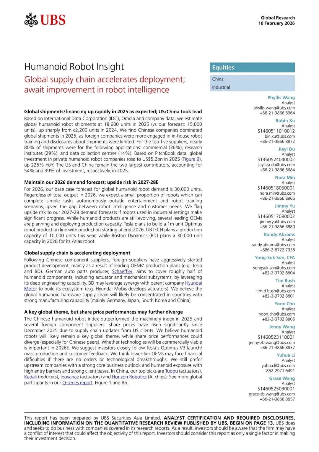 报告名称:人形机器人行业洞察:全球供应链加速布局(文末附全文PDF) 出 品 方:瑞银
