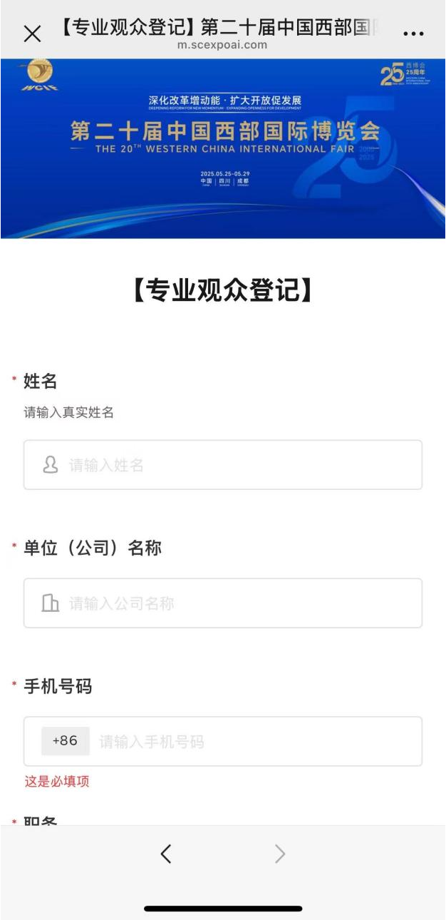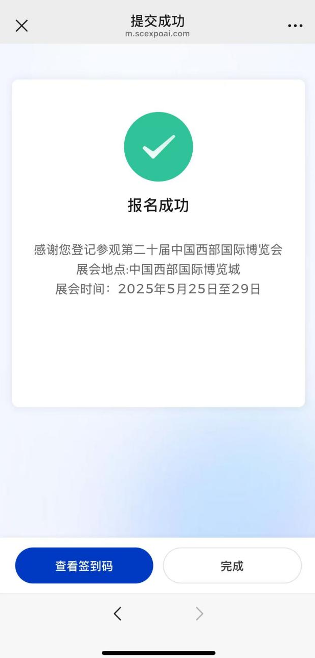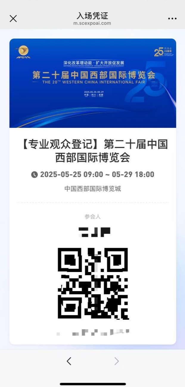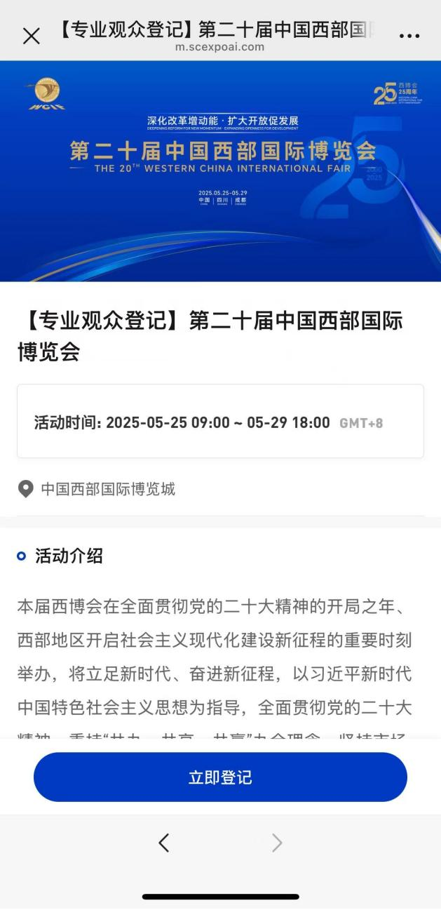 第二十届中国西部国际博览会将于2025年5月25日—5月29日在成都举行。观展时间为:5月25日(13:00—16:00),5月26—28日(09:30—16:00),5月29日(09:30—13:00)。专业观众报名方式如下:►►►观展人员使用微信扫描下方二维码进行报名注册►►►点击“立即登记”►►►填写个人信息后点击提交►►►提交信息后会显示“报名成功”并生成报名凭证END*以上为专业观众报名方式,普通观众报名方式后续另行通知。来源:新闻宣传组
