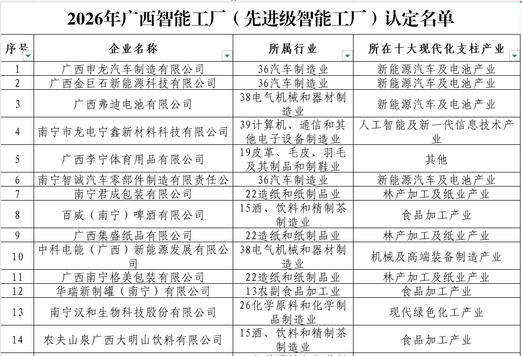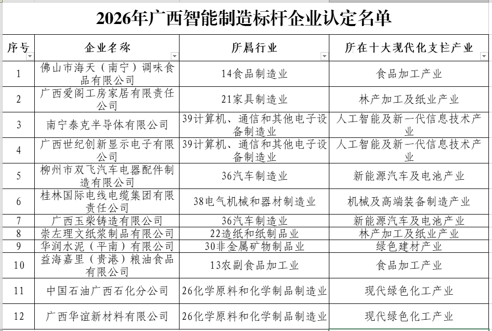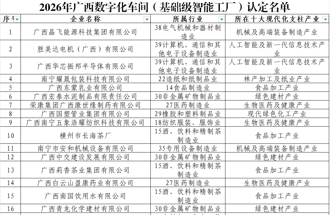 为落实《广西深入实施“人工智能+”三年行动方案(2026—2028年)》《广西制造业智改数转网联行动计划(2026—2028年)》等文件要求,加快发展智能制造,推动制造业智能化、绿色化、融合化发展,自治区工业和信息化厅组织开展了2026年广西智能制造标杆企业、智能工厂(先进级智能工厂)和数字化车间(基础级智能工厂)认定工作。经企业申报、地方推荐、专家评审、公示等程序,确定了2026年广西智能制造标杆企业、智能工厂(先进级智能工厂)、数字化车间(基础级智能工厂)名单(详见附件),现予以公布。