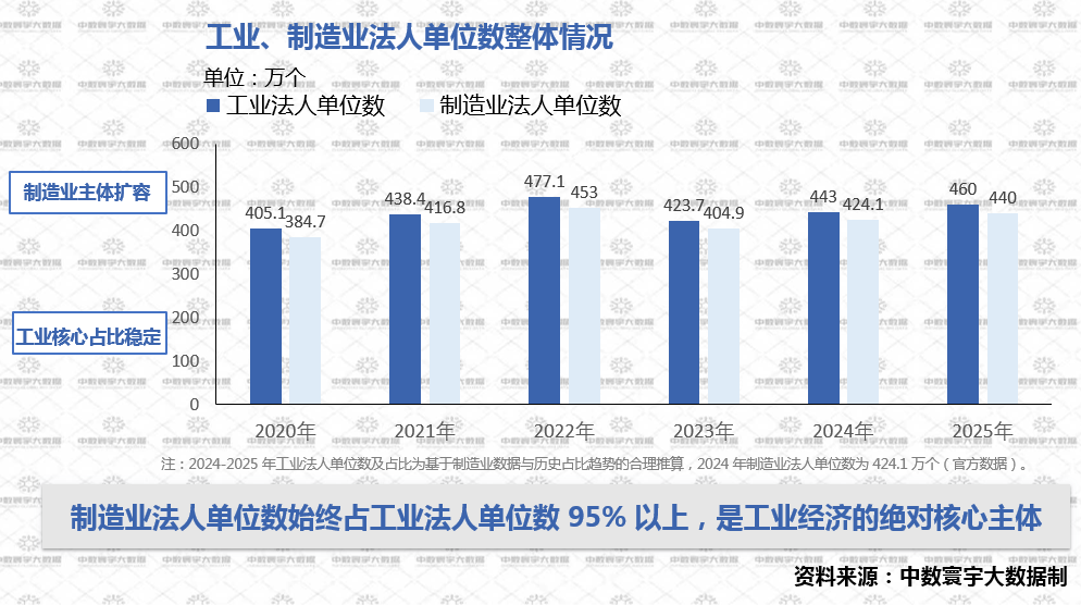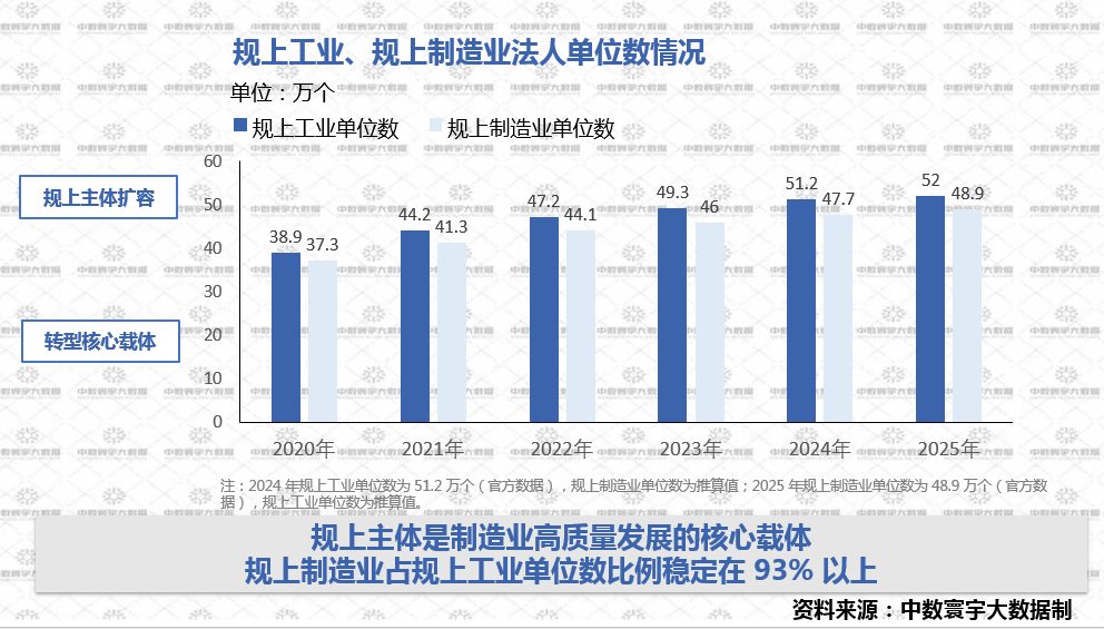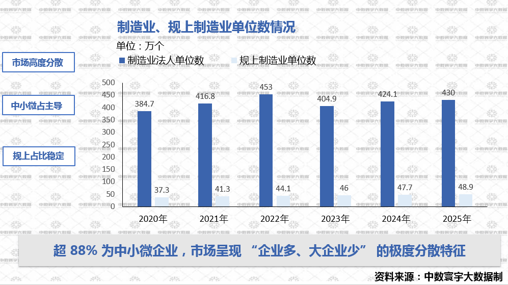 从2020-2025 年制造业法人单位数始终维持在 380 万个以上,2023 年达 404.9 万个,而同期规上制造业单位数仅从 37.3 万个增长至 48.9 万个,规上主体占比稳定在 10%-12% 区间,意味着超八成制造业企业为中小微规模。