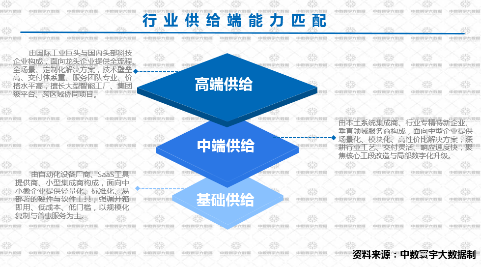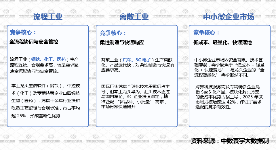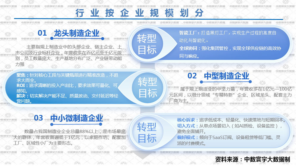 场景竞争的核心是 “市场结构与行业特性匹配”,当前,我国制造业呈现出显著的市场分散化特征,“超八成制造业企业为中小微企业”,且不同行业间工艺差异较大,由此形成了分层化的市场需求。在此背景下,三大阵营的市场定位恰好与这一需求分层实现了高度适配。