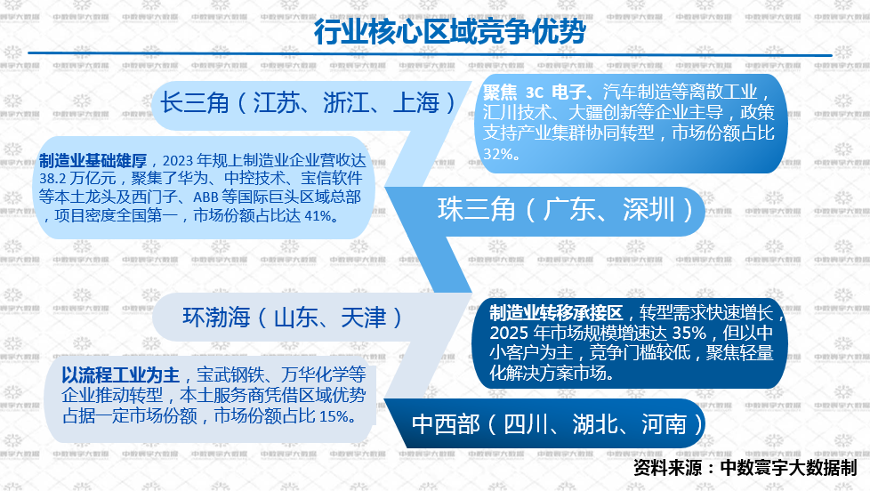 核心区域凭借 “产业集群 + 政策支持 + 技术生态” 三重优势,占据全国 88% 的中高端市场份额;中西部地区依托成本优势,成为中小微企业轻量化转型的主要市场,区域间形成 “高端引领、中端互补、低端普惠” 的竞争格局,与四大阵营的市场定位、多维竞争逻辑形成完美呼应。