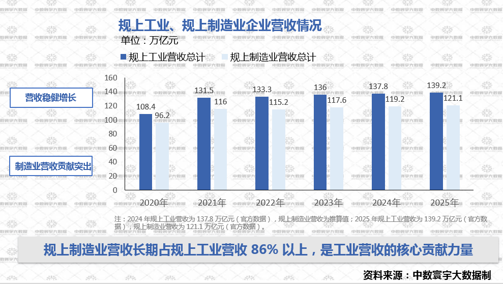 从营收规模来看,规上工业、制造业营收总量持续攀升,成为拉动经济增长的核心引擎。2020-2025 年,规上工业营收总计从 108.4 万亿元增长至 139.2 万亿元,规上制造业营收总计从 96.2 万亿元增长至 121.1 万亿元,2024 年规上工业营收达 137.8 万亿元、规上制造业营收达 119.2 万亿元,制造业营收长期稳定占规上工业营收 86% 以上,是工业经济的核心组成部分。
