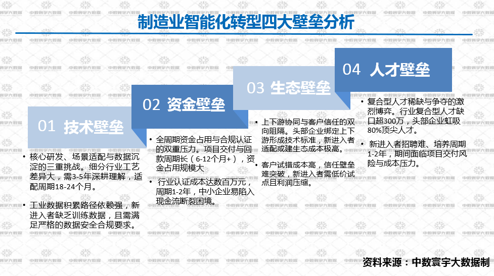 传统制造业智能化转型的高门槛,源于技术、资金、生态、人才的多重约束,既对新进入者形成严峻挑战,也要求行业内企业动态应对,具体如下: