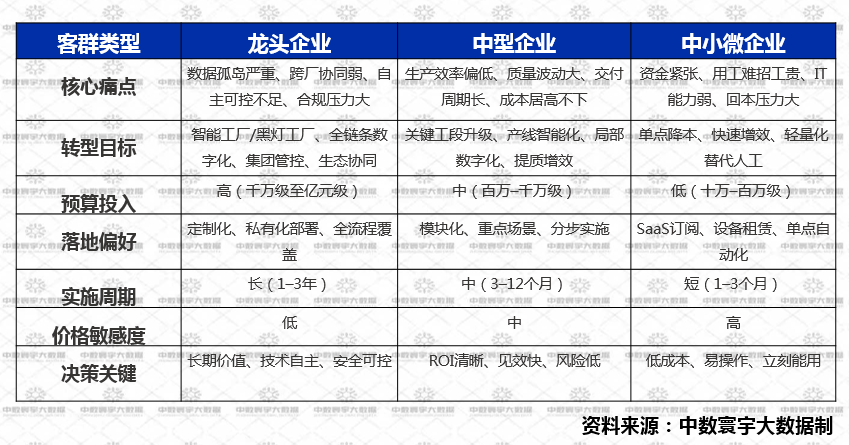 这种分散化格局直接导致需求分层,中小微企业的核心诉求是 “低成本、轻量化、快速落地”,无需全流程智能化改造,更关注单点场景的快速见效,对价格敏感度高,偏好SaaS 化服务或模块化解决方案。而龙头企业则聚焦 “全流程智能化协同”,需求覆盖研发、生产、供应链、服务全链条,重视技术自主可控与生态协同,愿意投入高额资金打造智能工厂、黑灯工厂,追求长期效益与行业标杆地位。