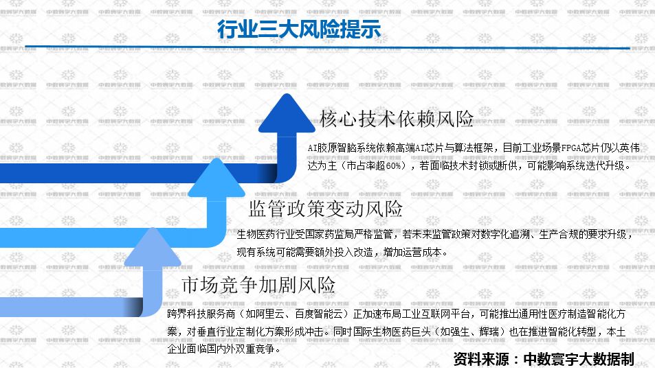聚焦生物医药智能制造领域,从核心技术、监管政策与市场竞争三个维度揭示风险:AI胶原智脑系统高度依赖英伟达等高端AI芯片与算法框架,技术封锁或断供将直接阻碍系统迭代升级;生物医药行业受药监局严格监管,若未来数字化追溯、生产合规要求升级,现有系统需额外投入改造,将增加运营成本;同时,阿里云、百度智能云等跨界科技服务商加速布局工业互联网平台,冲击行业定制化方案,加之强生、辉瑞等国际医药巨头推进智能化转型,本土企业面临国内外双重竞争的严峻挑战。