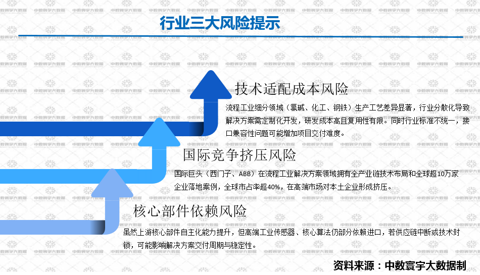 对流程工业领域,技术适配、国际竞争与核心部件三大风险,氯碱、化工、钢铁等细分领域工艺差异大、行业分散度高,导致解决方案需定制化开发,研发成本高、复用性有限,且行业标准不统一、接口兼容性问题增加项目交付难度;西门子、ABB等国际巨头在流程工业方案领域拥有全产业链技术布局与海量落地案例,全球市占率超40%,在高端市场强力挤压本土企业;尽管核心部件自主化能力有所提升,但高端工业传感器、核心算法仍依赖进口,供应链中断或技术封锁将直接影响解决方案交付周期与稳定性。