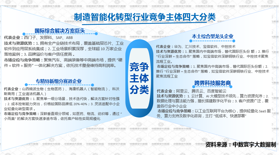 我国传统制造业智能化转型的行业竞争格局,核心呈现 “多阵营共存、多维竞争聚焦、区域集聚明显” 三大特征。不同层级市场参与者依托自身资源禀赋形成差异化定位,头部企业主导中高端市场,中小企业瓜分长尾需求,核心竞争围绕技术自主可控、场景适配性、产业链协同能力展开,且竞争主体、竞争维度、市场集中度与区域布局相互联动,共同构成完整的竞争生态。