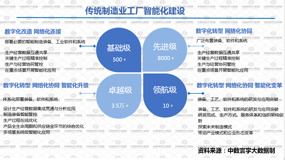 传统制造业工厂智能化建设的四级进阶体系,从基础级的“数字化改造、网络化连接”,到先进级的“数字化转型、网络化协同”,再到卓越级的“数字化转型、网络化协同、智能化升级”,最终到领航级的“数字化转型、网络化协同、智能化变革”。由此可见,我国制造业智能化转型已形成金字塔式梯队格局,多数企业仍处在基础向先进、卓越迈进的阶段,具备规模化推广的广阔空间.而少数领航企业则承担着技术突破与模式创新的先锋角色,为行业整体升级提供标杆与方向,这一结构既体现了转型的扎实基础,也预示着未来向更高阶智能化迈进的巨大潜力。