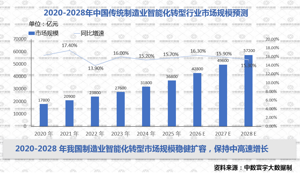 图表15:2020-2028年传统制造业智能化转型市场规模预测及同比增速