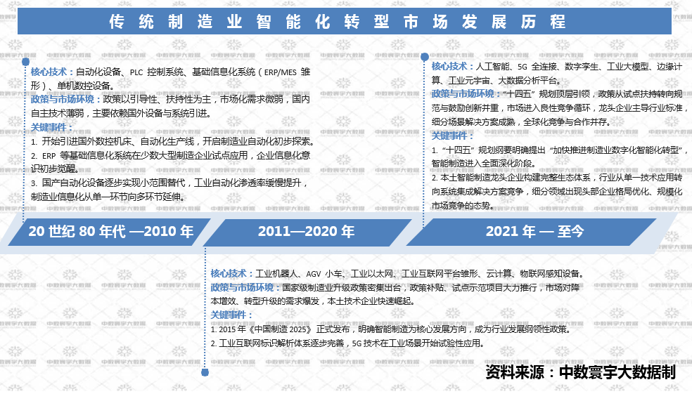 传统制造业智能化转型的发展历程可划分为三个阶段,整体呈现“技术铺垫 - 政策引领 - 深度融合”的演进脉络,各阶主要是围绕技术应用、政策支持、产业基础形成差异化发展特征。