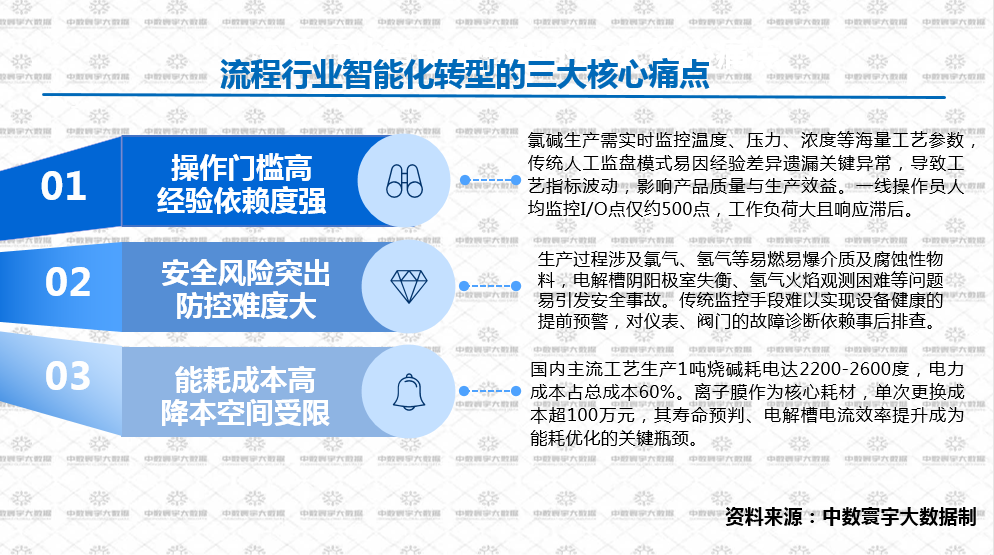 我国流程行业面临生产装置自动化程度低,设备分散独立运行,存在安全隐患,生产管理缺乏信息化系统等精细化管理和产业转型升级挑战。氯碱行业作为基础化工领域的典型流程工业,是国民经济重要支柱,但长期面临精细化管理不足与转型升级压力,核心痛点集中于三方面: