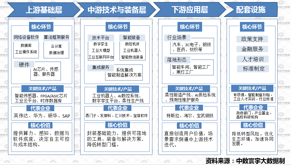 传统制造业智能化转型的产业生态链,上游基础层以AI芯片、传感器、工业操作系统、数据库等软硬件为核心,英伟达、华为、SAP等企业提供算力、感知与数据底座,决定了产业自主可控性与成本结构。中游技术与装备层通过数字孪生、工业大模型、工业机器人、系统集成等技术与服务,由西门子、发那科、汇川技术等企业封装为可落地的工具、装备和解决方案,大幅降低企业转型门槛。下游应用层则面向汽车、3C电子、钢铁、医药等行业,以智能车间、智能工厂为落地形态,特斯拉、海尔、宝武钢铁等企业将柔性制造、AI质检等技术转化为实际生产价值,同时场景需求又反向驱动中上游技术迭代。配套设施层则通过政策支持、金融服务、人才培训与标准制定,由政府部门、产业基金、高校科研机构等主体构建生态保障体系,降低转型风险,推动全产业链协同发展,共同构成了从技术供给到需求牵引的闭环,助力传统制造业向高效、柔性、智能方向升级。