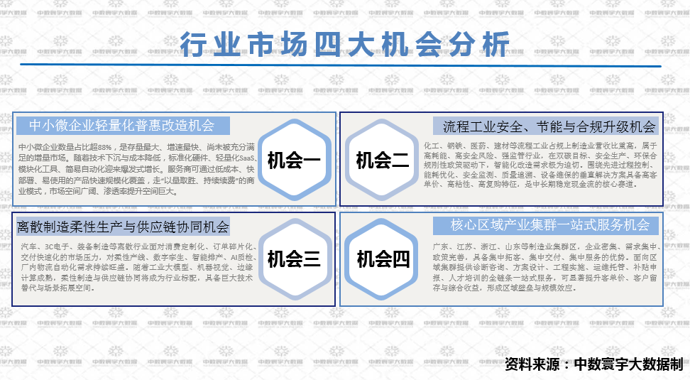 传统制造业智能化转型存在四大核心机会:一是中小微企业轻量化普惠改造,这类企业占比超88%,是未被充分满足的增量市场,可通过低成本、快部署的轻量化产品实现规模化覆盖。二是流程工业安全节能与合规升级,化工、钢铁等高耗能强监管行业在政策驱动下,对先进过程控制、安全监测等垂直解决方案需求迫切,具备高客单价与稳定现金流特征。三是离散制造柔性生产与供应链协同,汽车、3C电子等行业在定制化订单压力下,对柔性产线、数字孪生等需求旺盛,技术替代与场景拓展空间巨大。四是核心区域产业集群一站式服务,粤苏浙鲁等集群区需求集中,提供全链条服务可提升客单价与留存,形成区域壁垒。