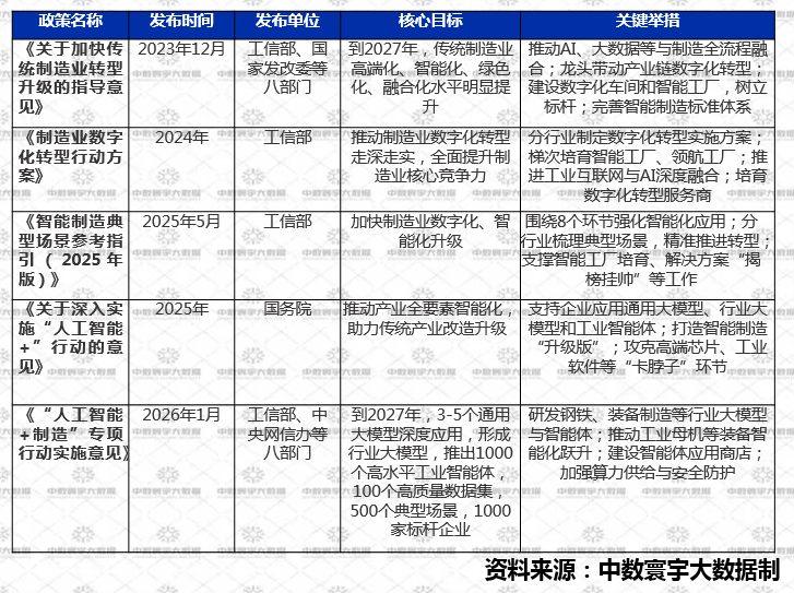 顶层战略持续加码,形成完整闭环。国家层面搭建“战略引导-路径规划-落地执行”的政策框架,从《中国制造2025》奠定转型基础,到《“十四五”智能制造发展规划》明确量化目标,再到2026年《“人工智能+制造”专项行动实施意见》聚焦深度融合,政策覆盖研发设计、生产制造、仓储物流、售后服务全生命周期,重点定向汽车、装备、电子、化工等传统制造业细分领域,为企业转型指明清晰方向。