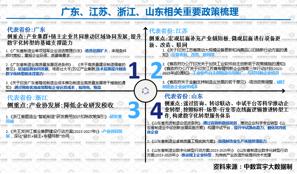 国家层面搭建 “战略引导 - 路径规划 - 落地执行” 的完整政策闭环,从《中国制造 2025》到《“十四五” 智能制造发展规划》,再到 2026 年《“人工智能 + 制造” 专项行动实施意见》,政策覆盖全生命周期,定向支持汽车、电子、化工等细分领域。地方政府形成差异化支持体系,广东聚焦产业集群与链主企业协同,江苏侧重产业链短板补齐与研发费用减免,浙江推进产业协同和数字化服务体系建设,山东强化中试平台与税收优惠,这些省份产业集群密集,转型需求更旺盛,项目优先布局可享受补贴红利,政策红利与市场需求形成共振。
