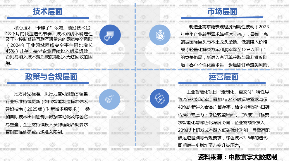 传统制造业智能化转型行业的高门槛与多维度风险,源于技术体系的复杂性、产业生态的成熟度、市场需求的特殊性及外部环境的不确定性,不仅对新进入者构成严峻挑战,即使是行业内企业也需持续应对动态变化的风险因素,具体可从进入难度的深层壁垒与潜在风险的多元维度展开分析。