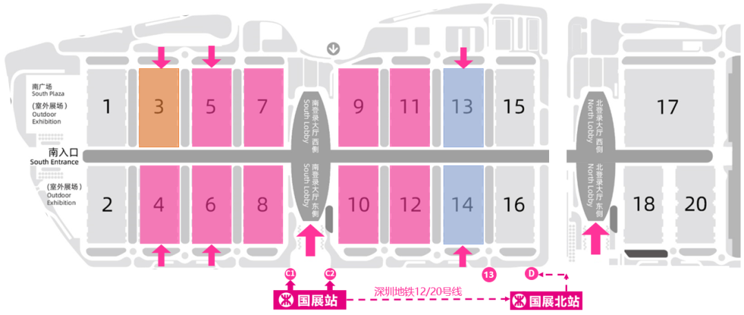 乘坐深圳地铁12/20号线前往国展站C出口或国展北站D出口,出站后可步行到深圳国际会展中心南登录大厅/13号门。