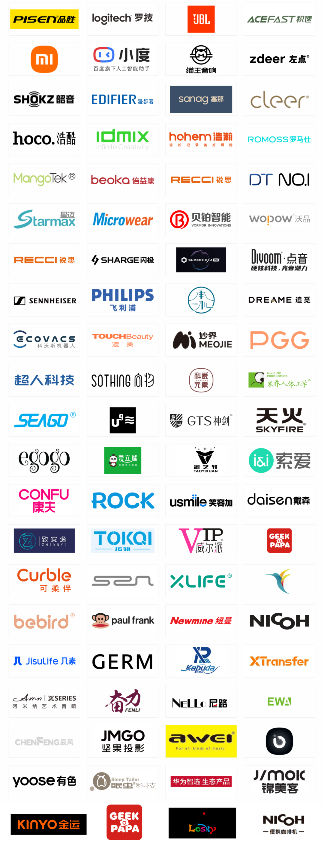 移动音频:韶音、漫步者、sanag塞那、Cleer、森海塞尔、猫王音响、JBL、小度、耐尔金、泊霖科技、战音、AWEI用维、阿米纳、纽曼、大嘴猴、嘉音美、辰风、品博士。