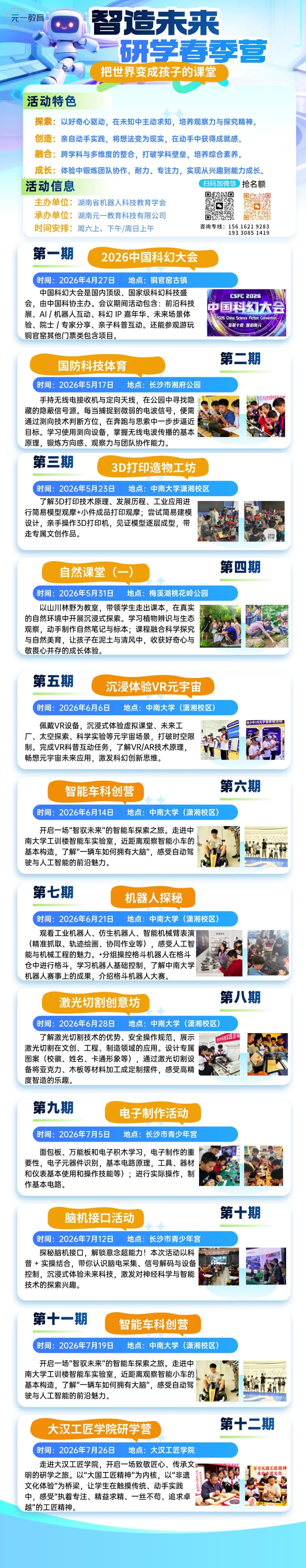 成长不止在课本里,更在动手与探索中。我们拥有湖南最优质的科创资源和师资团队。我们的研学项目有:2026年中国科幻大会、走进中南大学智能车工训楼国家级实验室,体验3D打印、机器人、激光切割、VR元宇宙;踏入自然课堂观察生态;用AI绘画创作数字艺术;在无线电测向中“猎狐”;于大汉工匠学院学习非遗技艺、传承工匠精神。