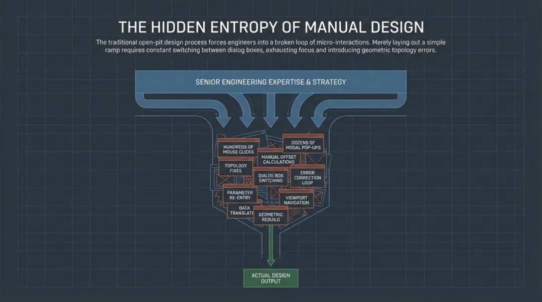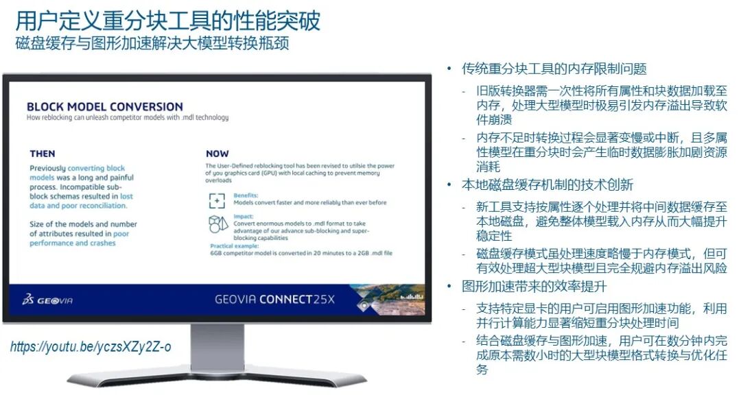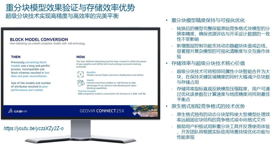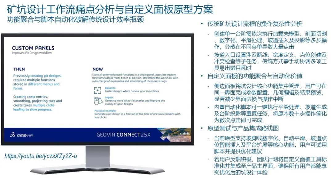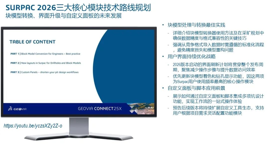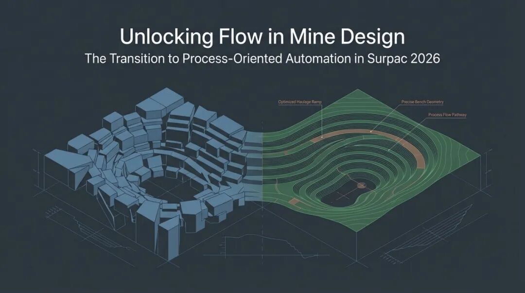 据统计,矿山工程师平均42%的日常工作时间耗费在重复性操作上——从地质断面绘制到坑道设计优化,再到报告生成。在Surpac用户中,仅18%的高级工程师会主动编写脚本或宏来自动化流程,其余82%要么依赖手动操作,要么受限于“录制宏”这种低效的线性自动化工具。这背后的根源在于:传统矿山设计软件缺乏“面板化”的交互范式,即将复杂操作封装为可视化模块,让非编程人员也能像搭积木一样定制工作流。在传统的露天矿设计中,工程师往往面临着“点击债务”的困扰:为了完成一个简单的坡道布置或台阶推演,可能需要进行数百次鼠标点击,并在数十个弹窗对话框之间反复切换。达索系统GEOVIA团队在Surpac 2026版本中,以UI面板化重构交互、以宏与自动化打通工作流,把工程师从重复劳动中解放出来。本文是GEOVIA CONNECT 25X实战系列第六篇,聚焦Glenn Barlow主讲的《Streamline your Mine Design Workflows with Surpac Macros》,本篇将进入矿山设计核心环节,用Surpac 2026全新工具,实现块模型高效处理、界面交互革新、露天坑一键化设计与参数跨项目继承。Glenn Barlow 不仅分享了软件的功能更新,更透视了矿山设计未来五年的技术走向,即从碎片化的命令操作进化为高度集成的智慧面板。本文将从底层块模型转换的性能革命谈起,穿过全新的用户界面交互逻辑,最后直抵那个令人振奋的“未来视界”——基于 Python 脚本定制的自动坑道设计原型。这是一次关于矿山设计效率边界的深度探索。一、块模型转换的革命——从“数据搬运”到“智能重构”