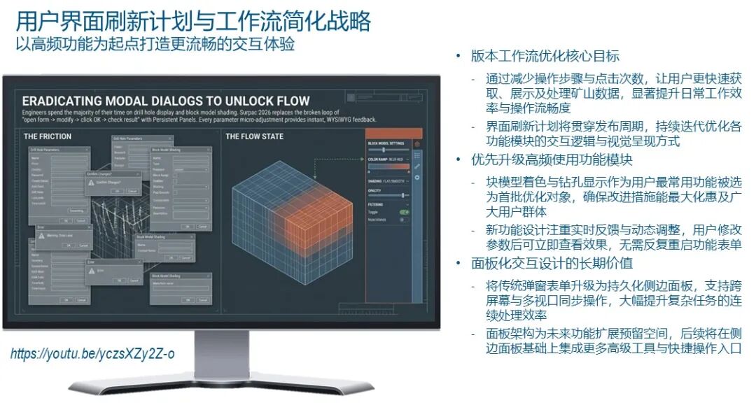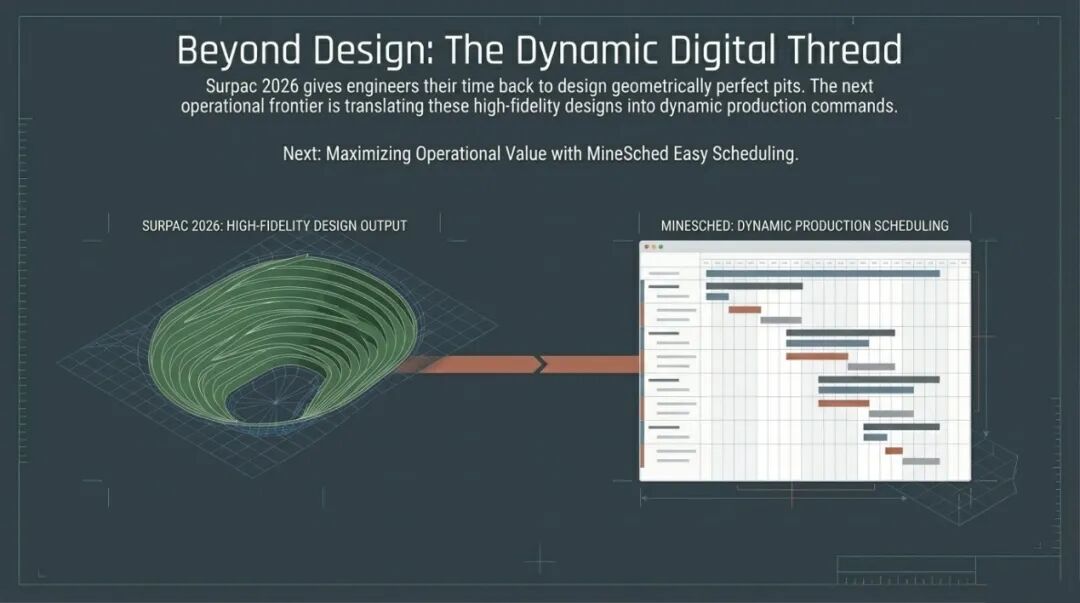 总结来说,Glenn Barlow为我们展示的不仅是Surpac 2026的新功能,更是一次矿山工程设计效率的“升维打击”。从支持GPU加速的User-Defined Reblocking,到彻底告别弹窗干扰的持久化UI面板,再到能够实现台阶自动推演的设计原型,Surpac正在从一个复杂的工具箱演变成一个流畅的、基于逻辑流的闭环系统。这种转变对于那些追求极致生产力的现代化矿山来说,无疑具有重大的战略意义。作为“从地质建模到智能矿山的全流程优化”系列文章的一部分,我们已经看到了数据如何从原始的钻孔信息转化为高精度的块模型,又如何通过自动化的设计手段转化为可落地的坑道方案。然而,设计仅仅是开始,如何将静态的设计方案转化为动态的生产指令?在下一篇文章中,我们将带您进入露天矿调度的核心领域,通过《MineSched露天矿高效调度:从战略规划到尾矿管理的闭环》,探索如何利用Easy Scheduling技术实现开采效益的最大化。敬请期待。附录:Glenn Barlow演讲完整原文(优化版)
