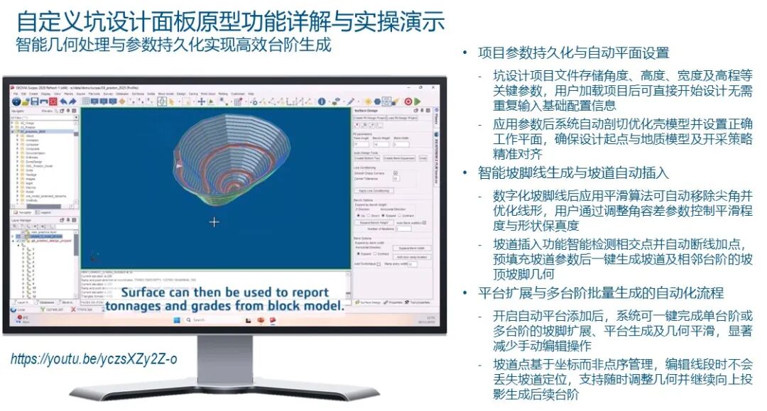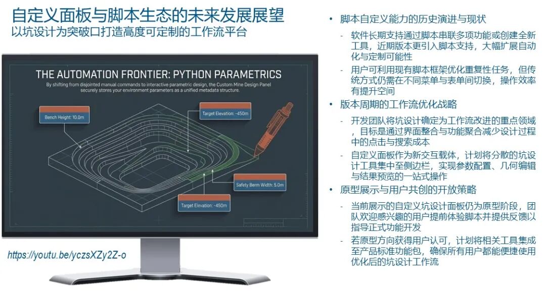接下来,我要带大家进入今天演讲最激动人心的部分:自定义坑道设计面板(Custom Mine Design Panel)。这是一项关于“未来矿山设计”的视觉预览。长期以来,Surpac用户习惯于利用宏脚本(Macros)来定制工作流。而现在,随着Python脚本引擎的深度集成,我们正在将这一能力推向全新的维度。我们构建了一个原型面板,它将破碎的坑道设计命令整合到了一个一体化的流式界面中。传统的坑道设计是一个典型的多步骤、非线性过程。你需要加载壳体、生成平面剖面、手工数字化边坡线、调整平滑度、布置坡道入口、处理多台阶投影、设置平台宽度。每一个步骤都对应着不同的菜单和工具栏。据我们统计,完成一个完整的坑道推演,工程师可能需要点击鼠标上千次。这种高强度的手动操作不仅容易产生疲劳,更容易在处理复杂的坡道交汇点时引入几何拓扑错误。我们在Surpac 2026中推出的这个原型面板,旨在实现“参数化设计”与“交互式建模”的完美融合。面板的核心是一个被称为“设计项目(Design Project)”的元数据结构。它可以存储你当前设计的所有环境参数:台阶高度、坡道宽度、安全平台参数、目标坑底标高以及正在参考的优化壳体。这意味着当你因故中断工作,或者在第二天重新打开软件时,无需重新输入这些冗长的参数,系统会自动带入你之前的逻辑状态。在演示中,你可以看到自动设计工具的惊人威力。当我开始数字化第一条边坡线(Toe line)时,我不再需要小心翼翼地捕捉每一个点。我只需要大致勾勒出形状,系统内置的平滑算法会自动剔除那些尖锐的角度。更神奇的是坡道布置:你只需在设计线上指定一点,系统就会根据预设的宽度和坡度,自动在当前线段上切开缺口,插入坡道点,并生成符合几何规范的坡道模板。这种自动化极大地降低了坡道设计的门槛。在传统方法中,为了插入一个坡道,你需要手动断开线段、计算偏移量、生成辅助点,最后再重新闭合线。而在这个自定义面板中,一切都是瞬时完成的。系统不仅能自动生成当前的坡顶线,还能联动生成下一个台阶的坡底线。你可以选择“自动添加平台”模式,只要按一下“推演(Expand)”键,软件就会根据台阶参数,自动向上或向下推演出整个坑道雏形。更具突破性的是“平台扩展(Berm Expansion)”功能的革新。在传统的Surpac操作中,如果你需要为了拟合优化壳体而调整某段平台的宽度,过程极其痛苦。你得断开线、重新数字化、删除冗余点、合并、平滑。而在我们的新面板中,你只需简单地在那段需要调整的线上扫过,系统会自动检测交叉点,并智能地将新线段融合进原始拓扑结构中。这种操作逻辑非常接近于现代的图形编辑软件,极大地降低了操作的认知负荷。值得一提的是,这个工具解决了矿山设计中一个由来已久的难题:坡道点丢失。在传统的坐标索引模式下,一旦你修改了设计线的点序,坡道点往往会发生偏移甚至崩溃。而我们的新工具采用了基于坐标(Coordinates)的锚定逻辑。无论你如何平滑线段或重构平台,坡道点的核心地理位置始终受到保护。这确保了坑道设计在复杂的几何推演过程中,其开采技术条件的连贯性。在演示的最后,我仅用了不到五分钟时间,就从一个坑底起步线,完成了九个台阶的自动推演,并生成了包含完整坡道系统的复杂坑道三维表面。这一切的操作都是在同一个侧边面板中完成的,没有弹出任何干扰性的对话框。生成的表面可以直接进行品位报告、储量估算,或者与地形图进行布尔运算生成最终的施工图纸。虽然这目前还是一个原型阶段的定制化成果,但它代表了达索系统GEOVIA对未来矿山设计的思考。我们希望将矿山设计师从“绘图员”的角色中解放出来。未来的Surpac不仅仅是一个精准的测量和建模工具,它将进化为一个具备“设计感知”能力的智能引擎。通过深度定制的Python面板,每一个矿山都可以根据自己的开采技术规范,定义属于自己的自动化设计流。这就是我今天想分享给大家的Surpac 2026核心愿景:通过极致的性能优化夯实底座,通过持久化的面板逻辑优化交互,通过高度定制的自动化工具解放生产力。矿山设计不应是一项枯燥的重复劳动,而应是一场充满洞察力的探索之旅。如果您对这个自定义设计面板感兴趣,或者有更多的反馈和建议,欢迎在会后随时联系我。总结:从工具到平台,构建矿山设计的“自动驾驶”雏形