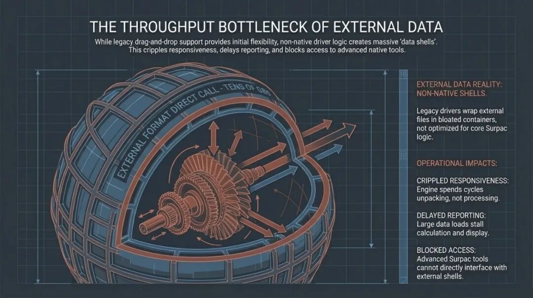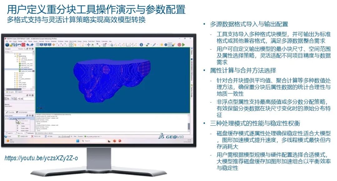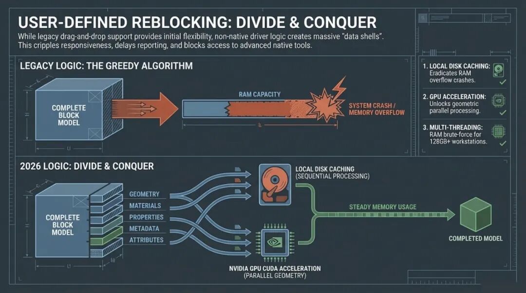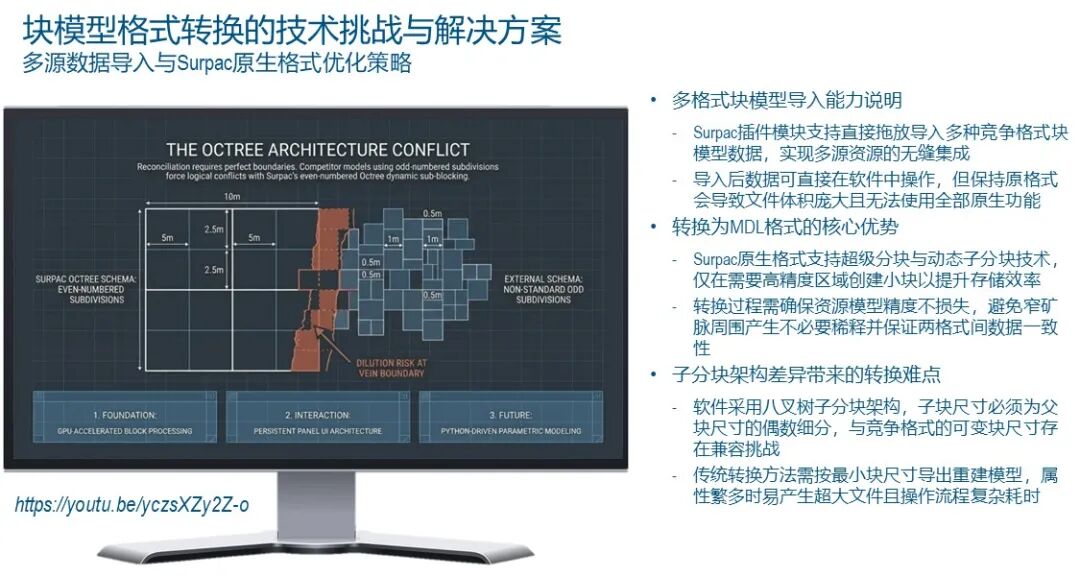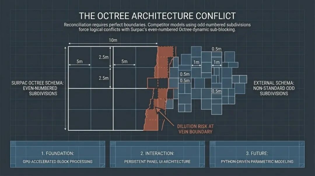 大家好,在接下来的时间里,我将向大家展示 Surpac 在 2026 版本中发生的根本性变革。这些变革的核心只有一个目标:通过精简矿山设计与工程流转中的每一个环节,把宝贵的时间还给设计师,让他们去思考更优的开采方案,而不是被琐碎的软件操作所束缚。今天的分享我打算分为三个核心章节来推进。首先,我们将深入探讨块模型处理的底层逻辑,特别是关于块模型转换器的重大性能优化,以及如何建立符合工业4.0标准的最佳实践。其次,我会带大家预览Surpac 2026中焕然一新的用户界面,理解“面板化”设计背后的交互逻辑。最后,我将展示一个面向未来的黑科技——自定义坑道设计面板,看我们如何利用Python脚本实现坑道设计的半自动化。让我们从矿山规划的核心——块模型(Block Model)谈起。在矿山设计的整个生命周期里,块模型是数据的最终汇聚地。无论是个地质资源模型还是开采规划模型,你都需要处理来自不同来源的海量数据。在现实的工业环境中,资源模型往往是由不同的部门、甚至不同的软件平台生成的。作为达索系统的核心产品,Surpac一直致力于构建一个开放的生态系统,让我们能够无缝接入这些多元数据。传统上,Surpac提供了非常强大的插件模块,支持直接“拖放”诸如Datamine、Vulcan、Micromine或Minesight等友商的格式。这种灵活性在早期极大地便利了数据交互,但随着矿山数字化程度的提高,这种模式的弊端也日益显现。当你直接在Surpac内部调用这些第三方格式时,虽然表面上能读取数据,但底层依然运行着非原生的驱动逻辑。这种“数据套壳”模式往往会导致模型体积臃肿,甚至达到几十个GB。这种臃肿的模型在实际操作中简直是工程师的噩梦。它反应迟钝、显示缓慢、报表输出极其困难,更致命的是,它无法完全调用Surpac顶层的全量高级功能。这就像是在一台超级计算机上运行模拟器来跑过时的程序,其整体效能(Throughput)被严重限制。因此,我们始终建议用户将外部模型转换为Surpac原生的.mdl格式,以解锁真正的性能巅峰。Surpac的原生.mdl格式之所以高效,是因为它采用了先进的块技术,如超级块(Super-blocking)和动态子块(Dynamicsub-blocking)。这意味着系统可以智能识别那些无需精细描述的区域,将它们合并为大块;而只在那些品位变化剧烈的薄脉区域,根据需要生成微型块。这种空间划分机制就像是计算机科学中的“四叉树”或“八叉树”算法在三维空间中的极致应用,极大地优化了存储和计算效率。然而,传统的转换过程往往充满挑战。当你试图将一个复杂的外部模型导入.mdl格式时,最大的恐惧莫过于“精度丢失”。我们不希望在合并块的过程中产生不必要的贫化(Dilution),尤其是在狭窄的矿脉附近。作为工程师,我们追求的是极高的对账精度(Reconciliation),希望转换后的模型能100%还原原始模型的资源量。但现实中,由于各个软件采用的子块架构(Sub-block Schemas)各异,这种匹配过程往往异常痛苦。这种痛苦的根源在于Surpac采用的八叉树子块架构(Octree Schema)。这意味着所有的子块必须是父块尺寸的偶数次细分。例如,如果父块是10米,那么子块可以是5米、2.5米、1.25米,或者是0.625米。如果你拿到的竞争对手模型包含1米或0.5米这种无法通过10米父块进行偶数划分的子块尺寸,软件底层就会出现逻辑冲突,导致转换后的边界无法精准贴合。在过去,为了解决这个几何逻辑上的矛盾,我们的最佳实践往往是先将模型导出为最小子块尺寸的文本文件,然后在Surpac中建立一套全新的、基于该最小尺寸的.mdl架构,最后再重新导入。这个过程虽然有效,但极其繁琐且冗长。特别是当你的模型拥有几十个甚至上百个属性属性(Attributes)时,中间生成的数据交换文件会变得极其庞大,整个过程就像是在进行一场数据迁移的马拉松。我们一直认为,工程师不应该在这些重复性的数据搬运上耗费精力。软件应该在底层自动处理这些复杂的逻辑转换。在旧版的块模型转换器中,由于采用了全内存加载机制,当处理超大规模模型时,经常会触发内存溢出错误。这是因为系统试图一次性加载所有属性并进行重构。这种贪婪的算法逻辑在现代超大规模矿山面前,往往显得力不从心,导致系统崩溃或长时间的无响应。为了彻底解决这一痛点,我们在Surpac2026中引入了一项划时代的功能:用户定义重新分块(User-Defined Reblocking)。这项新技术相比前代版本有两项质的飞跃。第一是引入了本地磁盘缓存机制(Local Disk Caching)。现在,系统不再试图一口气吞下整个模型,而是将模型按属性进行解构,一次只在一个属性上工作。这种“分而治之”的策略确保了内存占用的恒定,极大地提升了系统的稳健性。第二项飞跃则是对GPU加速的全面支持。长期以来,块模型的重构计算几乎全部依赖于CPU的单核或多核运算。而在2026版本中,我们成功解锁了图形处理器(GPU)的并行计算潜力。只要你的电脑配备了支持CUDA技术的NVIDIA显卡,转换速度将得到几何倍数的增长。这种变革就像是从单车道升级到了八车道的高速公路,即便是处理数十亿个块的大型模型,转换过程也能在几分钟内完成。在演示界面中,大家可以看到User-Defined Reblocking的激活流程非常直观。在输入端,我们不仅支持Datamine和Vulcan格式,还支持CSV以及Surpac自家格式的深度重构。在输出端,虽然主推.mdl格式,但我们也保留了向其他格式反向输出的灵活性。你可以自