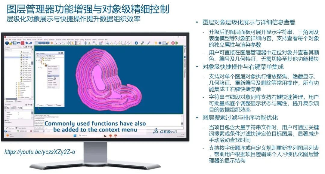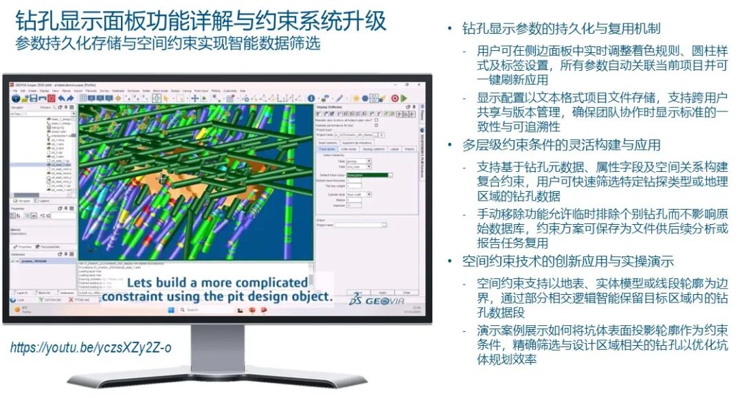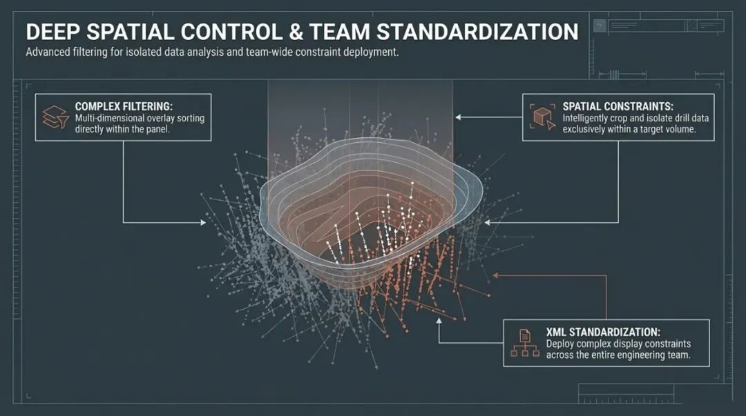 现在,让我们进入第二个章节:Surpac 2026 UI面板化的革命。在矿山设计的日常工作中,工程师绝大部分的时间都花在了钻孔显示和块模型着色上。然而,传统的软件逻辑充斥着大量的“模态对话框”。当你想要修改钻孔显示的某个参数,比如将颜色映射从岩石编码改为岩石类型,你必须先运行功能,弹出表单,修改,点击确认,观察结果。如果发现不合适,你还得重复这一过程。这种往复式的操作流程在本质上是断裂的。每一次弹窗都是对工程师思维流(Flow)的一次打断。我们希望引入一种“持久化”的交互方式。在2026版本中,我们全面引入了“面板(Panels)”的概念。当你激活钻孔显示功能时,参数调整面板会出现在屏幕的一侧,并保持常驻。任何微小的参数变动——无论是显示半径的微调,还是过滤条件的改变——都会即时反馈在三维绘图窗口中。这种“所见即所得”的实时性极大地提升了决策的速度。更重要的是,我们引入了“显示属性项目文件(XML)”的存储机制。这意味着你可以将复杂的钻孔显示方案,包括颜色映射方案、标签格式、甚至是特定的三维过滤规则,一键保存并在团队内部共享。你可以直接在面板中加载这些XML配置文件,确保整个设计团队在同一个视觉语言下进行沟通。对于高级用户,这些XML文件甚至可以通过文本编辑器进行批量脚本化修改。说到过滤,Surpac 2026的约束功能也得到了史诗级的增强。过去,你可能需要编写复杂的逻辑语句来筛选钻孔。现在,你可以直接在持久化面板中利用钻孔的元数据或属性进行多维度叠加过滤。例如,你可以一键排除所有的探槽数据,只保留反循环(RC)和金刚石钻孔。甚至可以通过空间约束功能,利用一个地表的投影轮廓或一个特定的封闭三维实体,实现钻孔数据的空间裁剪。这种空间约束在实际应用中非常强大。比如,我只想看落入某个特定露天坑设计壳体内部的钻孔,我只需要将坑底表面加载为约束,系统就会智能地保留那些与该表面投影相交的部分。这种精细的“局部观察”能力,让工程师在进行局部开采计划设计时,能够剔除一切干扰信息,专注于眼前的核心目标。这种基于属性与空间的复合过滤逻辑,在行业内目前是处于领先地位的。同样的逻辑也被应用到了块模型的着色面板中。现在,你可以动态地加载多个块模型,并通过右键菜单快速切换它们的可见性、显示风格(如边框或填充)。在面板中,你可以通过简单的下拉菜单切换着色属性,比如从金品位切换到铜品位,系统会立即响应并刷新色阶。这种快速切换能力对于理解多金属矿床的分布特征,以及验证资源模型的准确性,具有不可替代的价值。此外,Surpac 2026的层管理器(Layer Manager)也经历了深刻的重塑。现在的层管理器不仅仅是一个列表,它更像是一个深入数据的导航窗格。你可以直接下钻到层内的每一个对象,甚至是具体到某一个三角网格或某一个线段段落。你可以在层管理器中直接看到每个元素的颜色、属性,并通过右键菜单执行诸如缩放、隐藏、校验、重命名甚至删除等核心操作。这种“就地操作”减少了工程师在各种深层菜单中寻找命令的时间。在处理包含数千个线文件的大型项目时,新引入的搜索与过滤功能简直是救命稻草。你可以通过关键词快速定位某个设计线,或者根据字母顺序、创建时间对图层进行重新排列。这些看起来像是细节上的“质量生活(Quality of Life)”改进,在长期的高强度工作中,能累积出惊人的效率增益。我们希望Surpac不仅仅是一个计算工具,更是一个懂工程师操作习惯的智能伴侣。三、面向未来的自定义设计面板——从“功能组装”到“意图驱动”