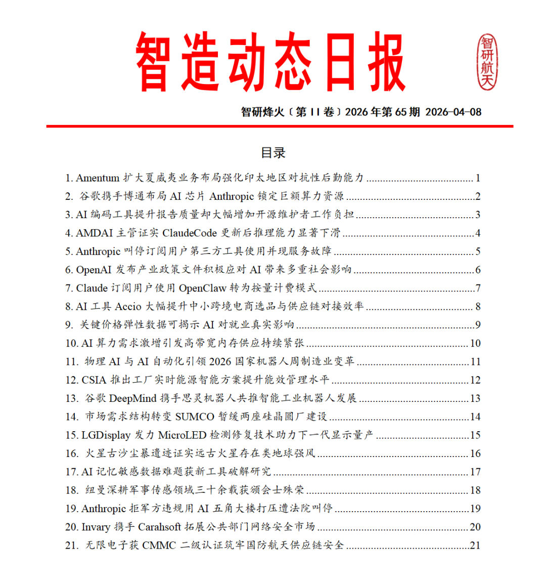 聚焦全球智能制造领域的权威情报产品,每日精选航空技术与应用、人工智能、工业机器人、增材制造、芯片工艺等核心技术突破与产业动态,以结构化、可编辑的文档形式呈现。内容涵盖技术解析、企业战略及政策影响,依托资深专家团队及强大的开源情报处理能力,助力企业快速捕捉技术趋势与市场机遇,把握智造脉搏,引领产业升级。