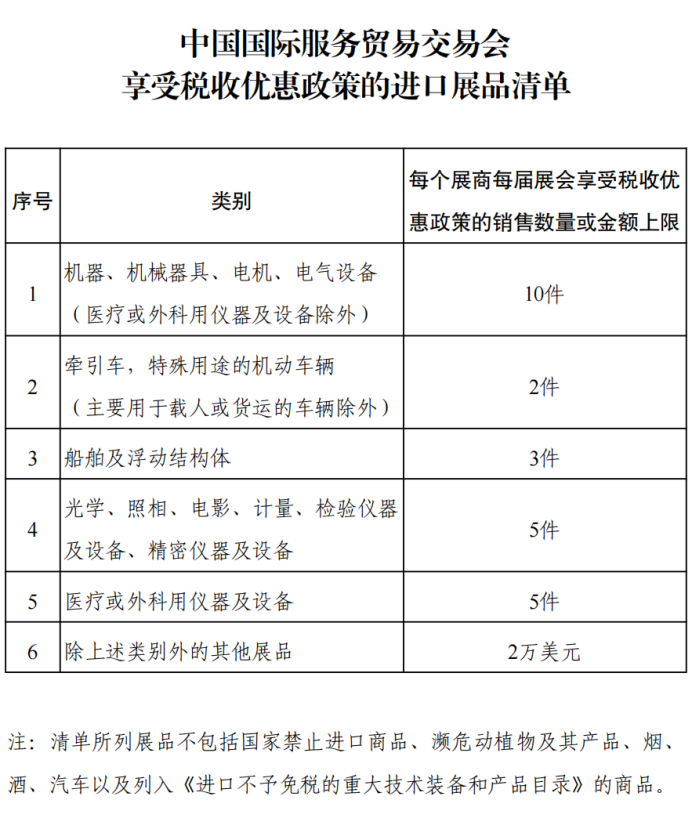 一、对服贸会每个展商在展期内销售的免税额度内的进口展品,免征进口关税、进口环节增值税和消费税。享受税收优惠政策的展品类别和销售额度等规定见附件。