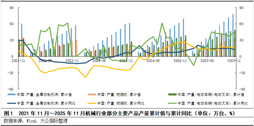 2025年1~11月,金属切削机床累计产量达78.3万台,累计同比增长12.7%;其中数控金属切削机床高于普通机床增速,表明行业正向高精度、智能化方向加速升级;但11月当月产量同比转负或为高基数效应,以及传统制造业淡季及部分企业库存调整有关。2025年1~11月,挖掘机累计产量达34.2万台,同比增长16.2%,延续强劲增长态势;国内矿山基建需求韧性叠加“两重”、“两新”项目落地、老旧设备更新,支撑内销增长;出口销量和金额累计均同比增长,受益于“一带一路”国家基建需求及国产设备性价比优势。2025年1~11月,电动叉车累计产量达48.6万台,同比增长44.4%,增速显著;主要受益于叉车电动化渗透加速,替代内燃机趋势明确;同时电商、新能源、医药等行业对智能仓储需求激增;出口方面,海外市场需求旺盛,尤其在欧洲、东南亚地区。