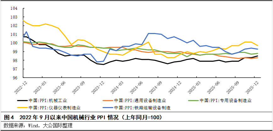2025年机械工业PPI(上年同月=100)全年在97.8~98.5区间波动,同比始终为负但降幅逐步收窄,7月降至全年低点,12月回升,环比自10月起连续3个月改善,显示行业价格在下半年逐步筑底。受全球经济复苏不均衡、国内基建投资节奏变化、原材料价格波动、国内设备更新政策落地及出口需求韧性等因素影响,机械行业各细分领域价格表现分化。细分领域来看,通用设备受制造业需求疲软影响,价格持续承压,通用设备制造业PPI全年呈缓慢下行趋势,价格压力主要源于传统机械产能过剩及内需复苏缓慢;专用设备在政策驱动下价格表现更稳定,PPI全年同比降幅最小,未来有望受益于“十五五”规划对工业母机、高端装备的政策支持,以及新能源、航空航天等下游行业的结构性需求增长;仪器仪表受行业技术升级推动价格企稳,仪器仪表制造业PPI全年呈现降幅持续收窄、年末企稳的态势,价格韧性源于高端仪器国产化加速及出口增长,技术溢价有效支撑价格水平;铁路运输设备制造业PPI价格震荡,主要与国内铁路网络建设节奏及海外轨交设备出口需求相关,同时受基建需求波动影响。