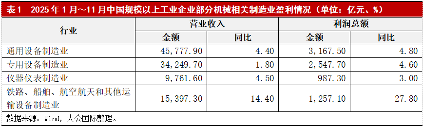 根据Wind数据,2025年1~11月,我国规模以上工业企业中通用设备制造业、专用设备制造业、仪器仪表制造业企业盈利能力稳中有升,营业收入与利润总额均实现正增长但增速分化;利润修复动能明显,但部分增速较上半年有所放缓,反映高基数与成本压力叠加影响。通用设备制造业受益于设备更新与出口增长,利润增速领先;仪器仪表制造业因高技术附加值支撑,利润率保持优势;专用设备制造业受传统领域需求疲软影响,营收增速放缓。同时,铁路、船舶、航空航天和其他运输设备制造业盈利表现突出,远超同期制造业主要行业,利润高增长的核心驱动力来自出口韧性与国家战略支持,呈现高技术壁垒、高附加值、强出口导向的特征。出口成为行业增长重要动力,通用设备、专用设备、仪器仪表均保持环比增长,尤其高端产品如工业机器人、精密仪器出口增速前列。政策驱动下,高端化、绿色化需求及出口支撑成为增长核心,但同时企业需强化技术研发与成本管控。