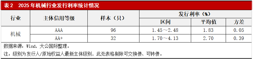 2025年,机械行业新发债以AAA级大型企业为主,信用质量向高级别集中。