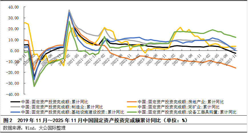 从宏观数据来看,2025年1~11月,全国固定资产投资完成额同比下降,主要受房地产投资拖累及基建发力不足影响。采矿业投资保持稳健增长,反映煤炭、油气等能源保供政策下的投资热度,带动矿山设备需求;制造业投资小幅增长,主要由高技术和装备制造拉动;基础设施建设投资(不含电力)基本持平。整体来看,固定资产投资呈现“总量承压、结构分化”特征。