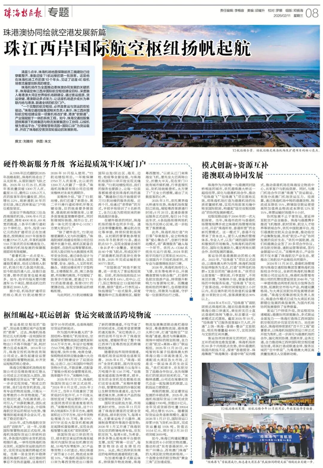 客运门户持续升级,货运枢纽快速崛起;港澳协同深度融合,多式联运全面发力——珠海打造珠江西岸国际航空枢纽的步伐坚定而有力。站在新起点,珠海将持续紧扣“百千万工程”部署要求,以珠海机场国际货运口岸正式开放为契机,进一步深化与港澳机场的合作,强化规则协调、资源共享、业务互通,合力推进珠江西岸国际航空枢纽建设加速,将其打造成联通全球、服务区域的“空中桥梁”,为粤港澳大湾区高质量发展注入空港新动能。