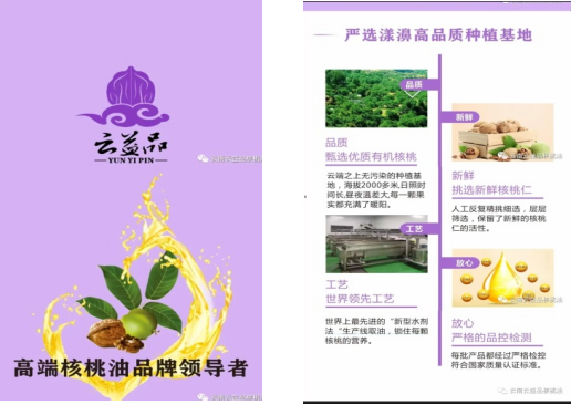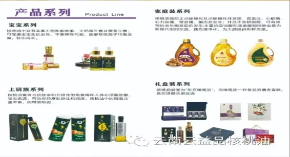 - 产品系列:围绕紫衣核桃等资源,开发出全营养核桃油、野生核桃油、紫衣核桃油、调合核桃油等产品,还利用“水剂法”生产的核桃油开发化妆品系列产品,利用取油后的油面开发脱脂核桃蛋白粉系列产品,利用榨油后剩余的油饼开发出核桃白酒、核桃饲料等。