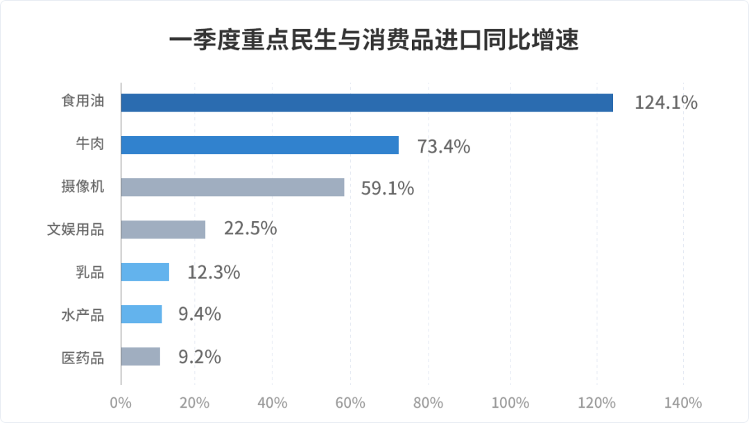 ☑️ 总体规模与增量贡献:基础民生与农食产品需求大幅提升受常住人口规模与促消费政策叠加影响,基础生活类物资进口增长显著。其中,食用油进口增速高达124.1%,牛肉进口增长73.4%,乳品(+12.3%)与水产品(+9.4%)等生鲜肉乳类产品亦保持稳健的刚需增长态势。